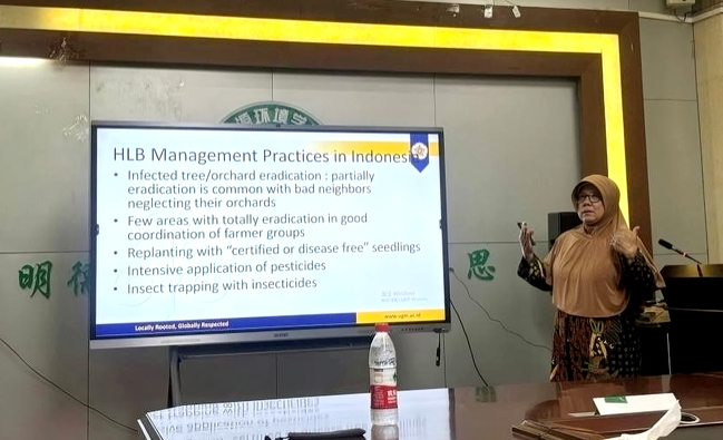 在交流座谈会上,Siti Subandiyah教授和Alan Soffan博士分别介绍了印尼的柑橘产业和黄龙病对产业的严重影响,以及该团队在黄龙病及其媒介昆虫——柑橘木虱研究方面取得的进展。我校柑橘黄龙病研究室郑正副教授则分享了黄龙病在我国发生的历史和现状,以及成功防控的做法、案例和经验。