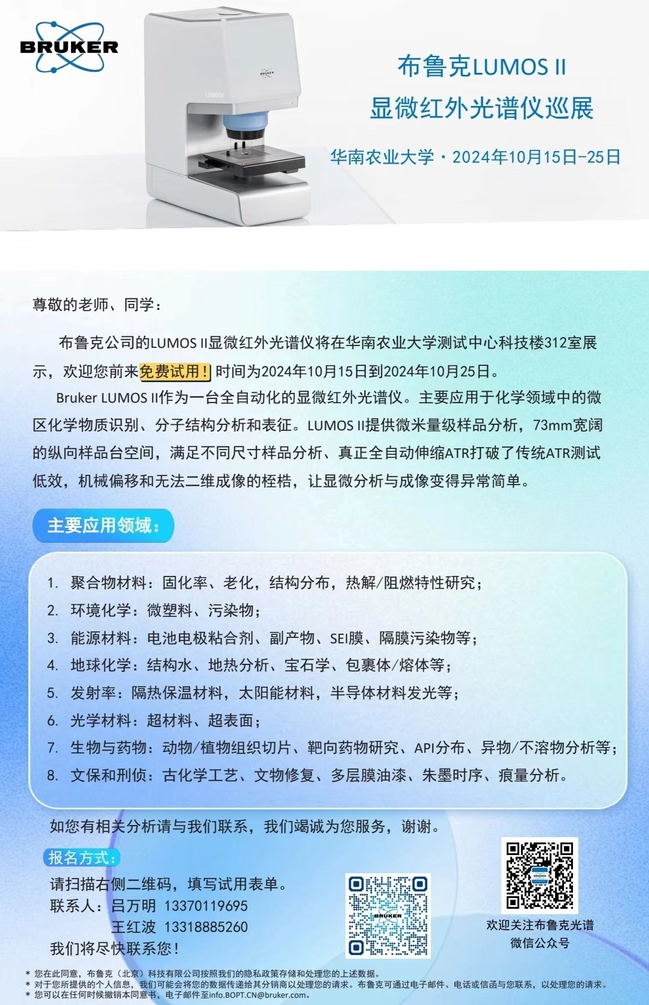 此外,我中心协商布鲁克公司的LUMOS II显微红外光谱仪于2024年10月15日至25日在科技楼312室进行展示,欢迎各位师生前来免费试用(详见附件)。