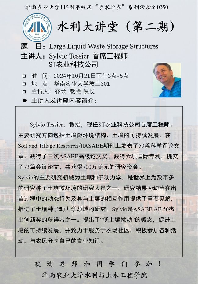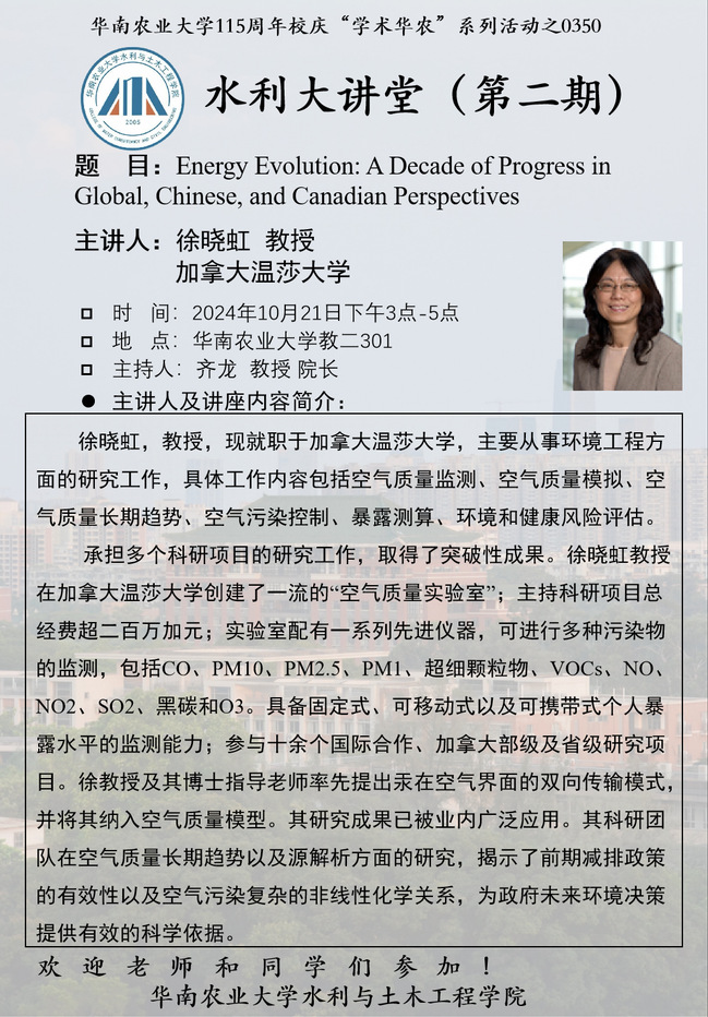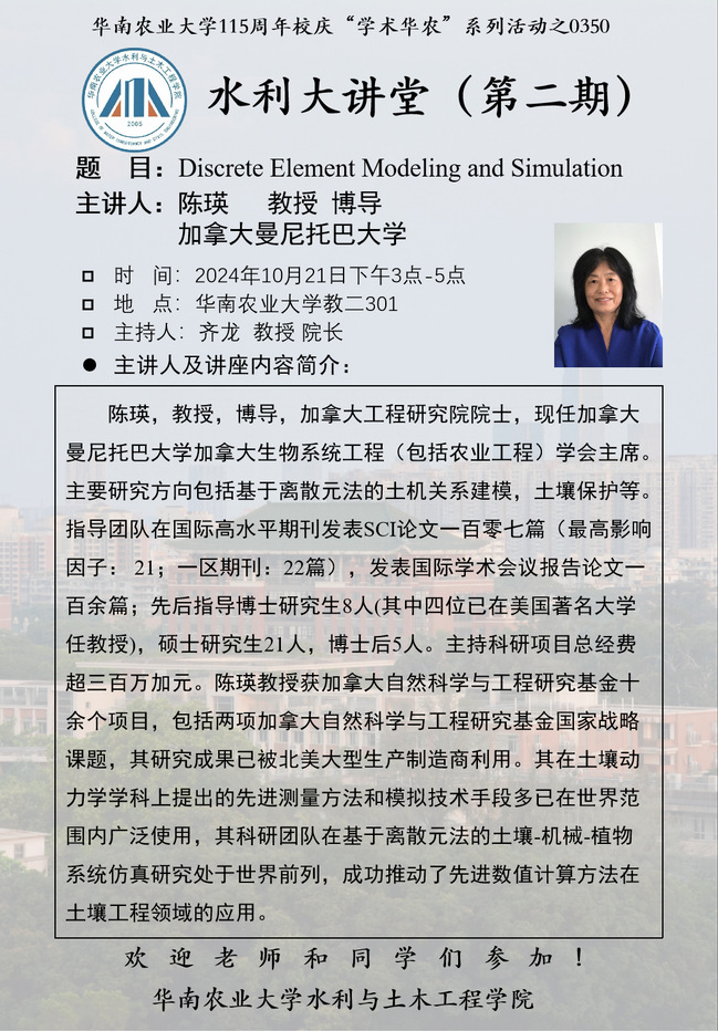 115周年校庆“学术华农”系列活动之0350:Discrete Element Modeling and Simulation;Large Liquid Waste Storage Structures;Energy Evolution: A Decade of Progress in Global, Chinese, and Canadian Perspectives