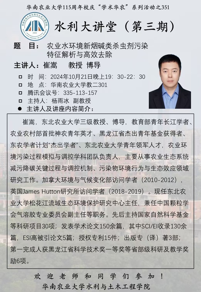 115周年校庆“学术华农”系列活动之0351:农业水环境新烟碱类杀虫剂污染特征解析与高效去除