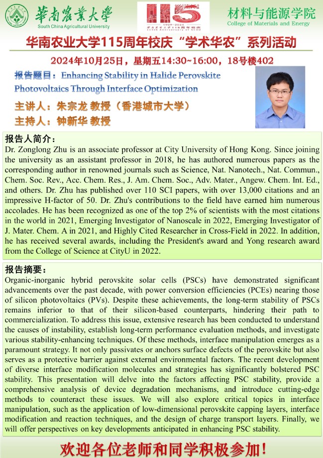 115周年校庆“学术华农”系列活动之0358: 材能学院学术报告:Enhancing Ctability in Halide Perovskite Photovoltaics Through Interface Optimization