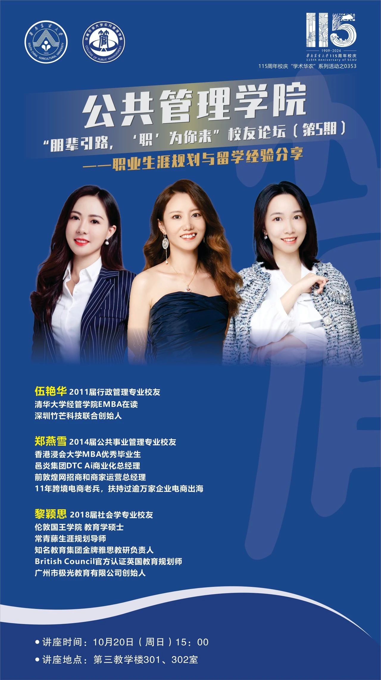 115周年校庆“学术华农”系列活动之0353:公共管理学院“朋辈引路,‘职’为你来”校友论坛(第5期)——职业生涯规划与留学经验分享