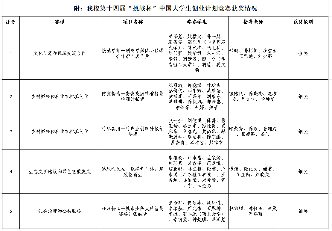 在刚刚落下帷幕的第十四届“挑战杯”中国大学生创业计划竞赛中,我校参赛团队凭借卓越的创新项目和出色的现场表现,荣获全国总决赛金奖1项、铜奖4项,这是继2016年以来学校在“挑战杯”国赛金奖领域取得的新突破。本届竞赛由共青团中央、教育部、人力资源社会保障部、中国科协、全国学联、陕西省人民政府联合主办,西安交通大学、共青团陕西省委员会承办。此次比赛共有来自2700余所高校的300多万名学生参与,累计收到39万余个创新创业项目。最终来自412所国内高校、14所国际高校的839个项目进入全国决赛终评。经过层层筛选和严格评审,我校“援藏粤茶-创响粤藏同心区域合作新‘茗’片”项目在众多优秀项目中脱颖而出荣获国赛金奖,“竹尽其用-竹产业创新升级领导者”“防微督检——畜禽疫病精准智能检测开拓者”“汪汪特工—城市安防犬用智能装备的领航者”“‘醇’风吹又生——以绿色甲醇,焕废物新生”四个项目荣获国赛铜奖。