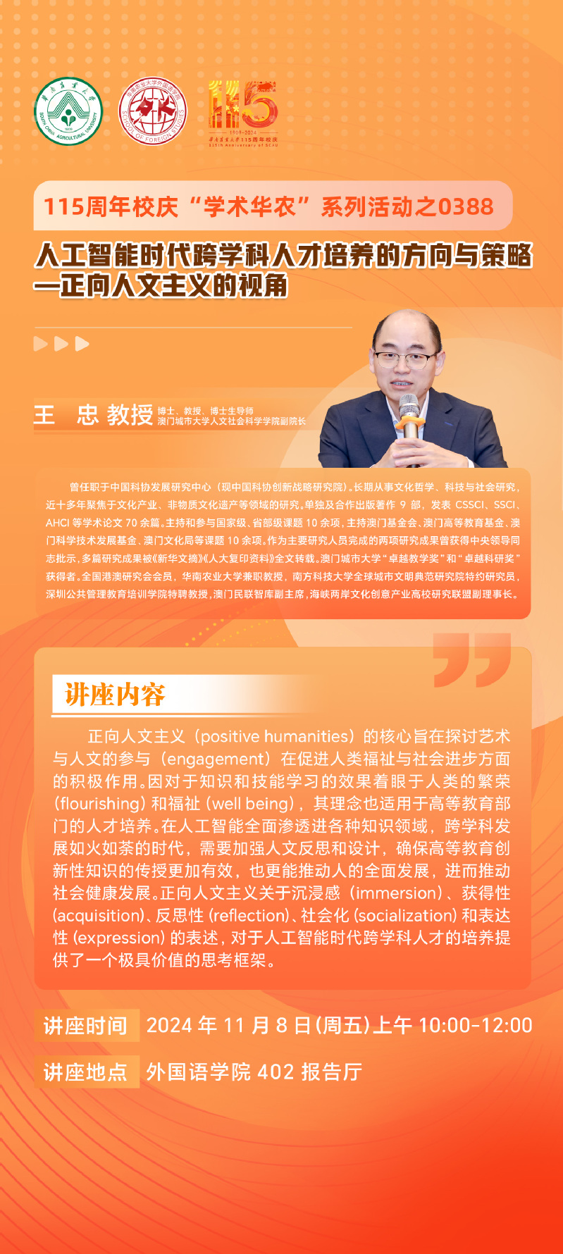 115周年校庆“学术华农”系列活动之0388:【外语讲坛】人工智能时代跨学科人才培养的方向与策略—正向人文主义的视角