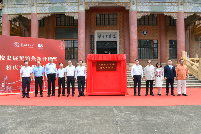 华南农业大学客座教授梁仲景伉俪,广东暨教集团董事长罗定,广东省人民政府文史研究馆馆员、华南农业大学客座教授胡江,广州万顺技术有限公司董事长陈志健,广州茶博馆馆长连俊江,校领导李凤亮、丁红星、温小波、杨运东、仇荣亮、钟强共同为新校史馆揭幕。