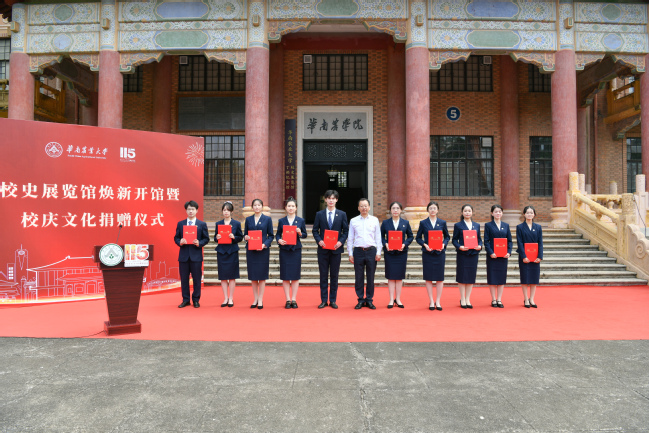 在校庆文化捐赠仪式上,罗定向学校捐赠孔子文化公园等景观文化工程,胡江捐赠“万世师表”孔子塑像及红满堂画作,连俊江捐赠茶叶一批,艺术学院李春阳老师团队捐赠《布衣院士—卢永根》连环画,李凤亮、钟强为嘉宾颁发捐赠证书。