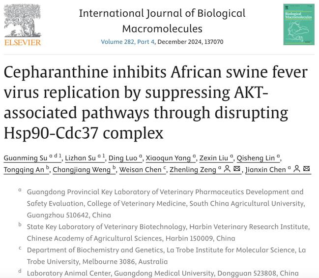 近日,我校兽医学院药理团队在国际知名期刊International Journal of Biological Macromolecules(中科院一区,TOP期刊,影响因子7.7)在线发表了题为“Cepharanthine inhibits African swine fever virus replication by suppressing AKT-associated pathways through disrupting Hsp90-Cdc37 complex.”的研究论文。