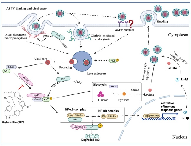 研究人员通过病毒感染细胞模型筛选抗ASFV药物/化合物,发现双苄基异喹啉类生物碱猪原代肺泡巨噬细胞(PAMs)中具有显著抑制ASFV增殖的作用,其中CEP的抑制作用最强,半数抑制浓度(IC50)为1.08µM。进一步通过作用机制研究发现,CEP可与热休克蛋白Hsp90结合,从而抑制Hsp90与伴侣蛋白Cdc37复合物的形成,下调病毒感染诱导的细胞Hsp90-Cdc37/AKT/糖酵解和Hsp90-Cdc37/AKT/NF-κB信号通路的活化,减少糖酵解代谢产物乳酸和炎症因子IL-1β的产生,从而抑制ASFV的增殖。该研究揭示了Hsp90-Cdc37复合物和糖酵解是潜在的开发抗ASFV药物的新靶标,并为CEP等双苄基异喹啉类生物碱在兽医临床上可能用于ASF的防治提供了科学依据。