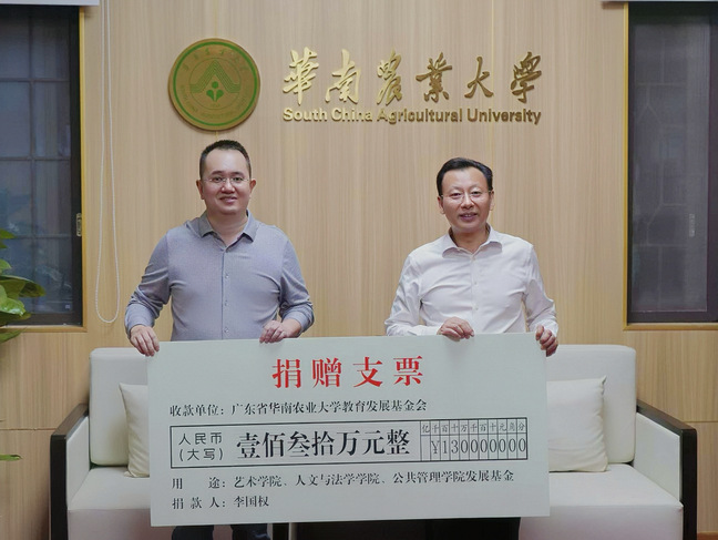 11月6日,2004级艺术学院艺术设计专业校友、广州市公管教育科技有限公司董事长李国权向学校捐赠价值240万元的物资与130万元人民币,用于支持学校发展建设。学校党委书记李凤亮、副校长钟强出席捐赠仪式。