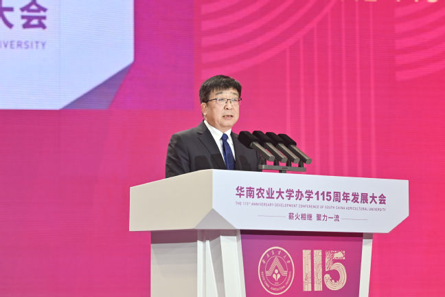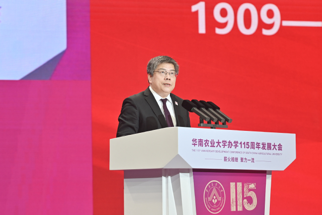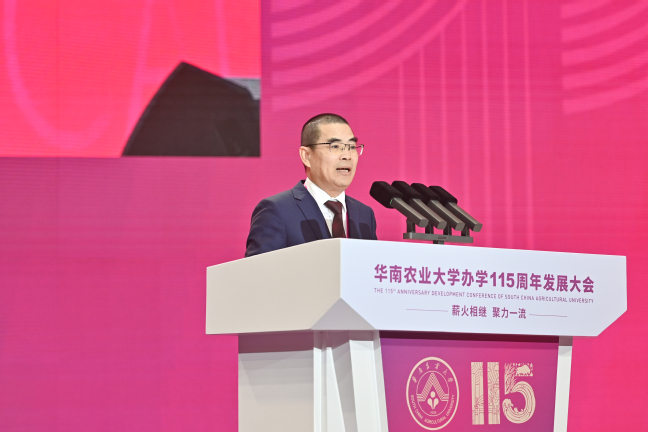 广东省人民政府党组成员陈良贤代表省委省政府向华南农业大学办学115周年表示祝贺。他指出,华农深耕南粤大地、牢记办学使命,为国家战略和区域发展作出了重要贡献。希望学校进一步增强服务教育强国、农业强国和建设教育强省、农业强省的责任感、使命感、紧迫感,以建设农业特色世界一流大学为引领,不断提升服务国家重大战略和广东经济社会发展的能力水平;希望华农老师大力弘扬教育家、科学家精神,努力做培育学生为学、为事、为人的“大先生”,做推动广东农业科技创新和产业发展的“建设者”,做服务“百千万工程”和绿美广东生态建设的“排头兵”;希望华农学子把课堂学习和乡村实践紧密结合起来,厚植爱农情怀,练就兴农本领,在乡村振兴大舞台上建功立业,争当知农爱农、追求卓越的行业领军人才。