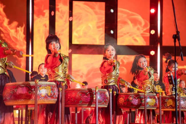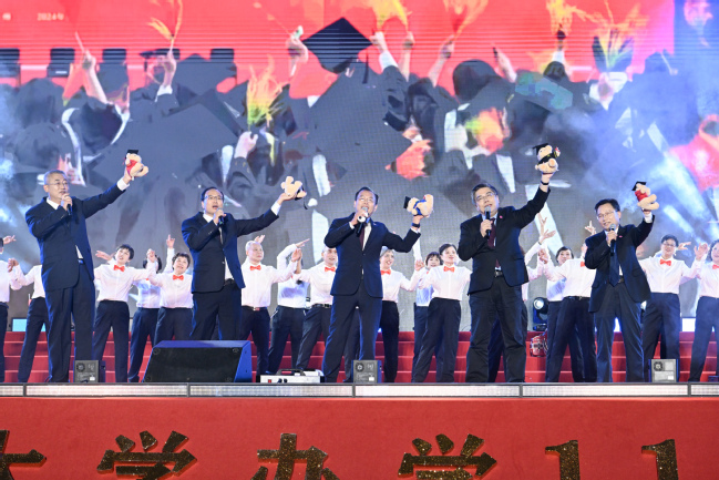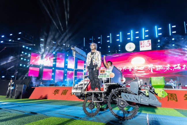 在华农附小“紫荆花”管弦乐团的演奏中,晚会拉开序幕。一则校友故事短视频后,伴随激昂的鼓声,两条无人机飞龙盘旋上空,宣告晚会震撼开场。传统非遗碰撞现代时尚,萌宠助阵T台走秀,主题说唱献礼母校华诞,还有情景剧讲述华农师生服务“百千万”的故事……节目类型丰富,内容精彩纷呈,华农元素满满,更有校领导惊喜献唱,一曲《朋友》引爆全场。音浪滚滚,声声入心,16个各具特色、各有精彩的节目后,在全场齐唱校歌《金色的理想》的悠扬旋律中,晚会圆满落幕。