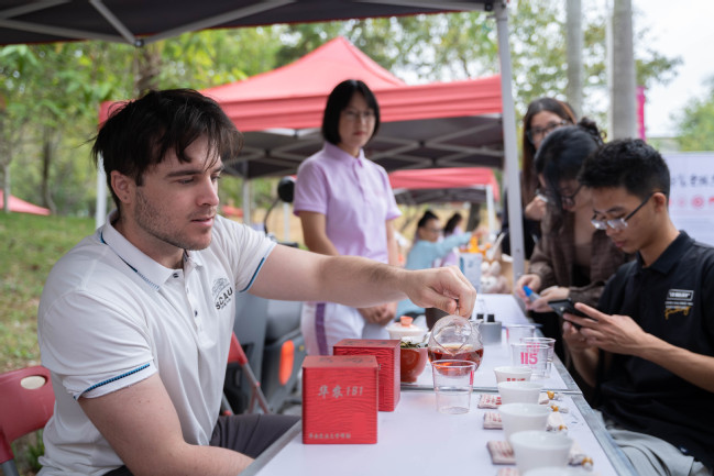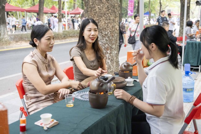 “以茶会友·万人品茗”活动在校内西南门至行政楼附近主干道两旁设置115张茶台,包含115款茶样,邀请师生校友共赏茶香四溢,细品茶之雅韵,亲身感受茶文化的独特魅力。沿途还有舞狮助兴,气氛拉满。据了解,本次活动既包括紫金蝉茶、西藏墨脱单丛茶以及华农115周年纪念茶饼等华农特色茶,也展示了来自全国各地茶企的不同品类。每张茶台都设置打卡点,集齐全部印章后可兑换礼品,还提供学校办学115周年特制品茗杯供茶友们选购留念。“在学校参加品茶活动很难得,还能借此机会与各路茶友相聚。”校友余女士是茶学专业出身,如今也在茶叶行业工作。她表示,非常高兴能在母校与师兄师姐和校友们分享茶叶的魅力。