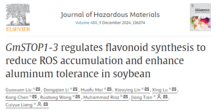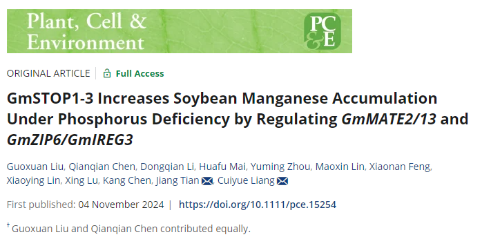 资源环境学院根系生物学研究中心、亚热带农业生物资源保护与利用国家重点实验室梁翠月研究员课题组在Plant, Cell & Environment和Journal of Hazardous Materials(中科院一区Top期刊)分别在线发表了题为“GmSTOP1-3 Increases Soybean Manganese Accumulation Under Phosphorus Deficiency by Regulating GmMATE2/13 and GmZIP6/GmIREG3”和“GmSTOP1-3 regulates flavonoid synthesis to reduce ROS accumulation and enhance aluminum tolerance in soybean”等系列研究论文。揭示了大豆“顾此失彼”地应对酸性土壤养分胁迫的机制。