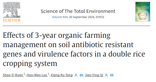 在环境科学领域国际著名期刊Science of the Total Environment发表了题为“Effects of 3-year organic farming management on soil antibiotic resistant genes and virulence factors in a double rice cropping system”的研究论文,揭示了有机栽培模式对土壤抗生素抗性基因和毒力因子的影响。文章第一作者为阮少艺博士,通讯作者为唐湘如教授和祁剑英副教授。