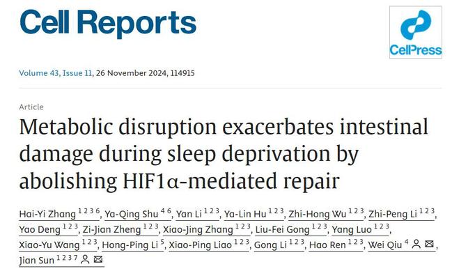 11月10日,兽医学院、国家兽医微生物耐药性风险评估实验室、广东省兽药研制与安全评价重点实验室的孙坚教授在国际权威期刊Cell Reports(影响因子7.5)上在线发表了 “Metabolic disruption exacerbates intestinal damage during sleep deprivation by abolishing HIF1α-mediated repair”的研究性论文。本研究发现了睡眠剥夺期间,代谢紊乱通过抑制HIF1α介导的修复功能,加剧了肠道损伤的分子机制。