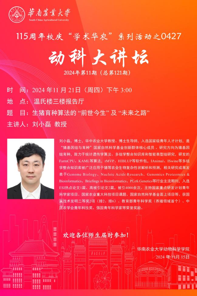 115周年校庆“学术华农”系列活动之0427:动科大讲坛第11期:生猪育种算法的 “前世今生” 及 “未来之路”