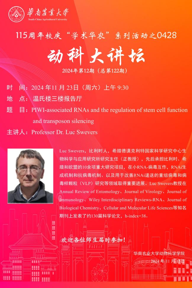 115周年校庆“学术华农”系列活动之0428:动科大讲坛第12期:PIWI-associated RNAs and the regulation of stem cell function and transposon silencing