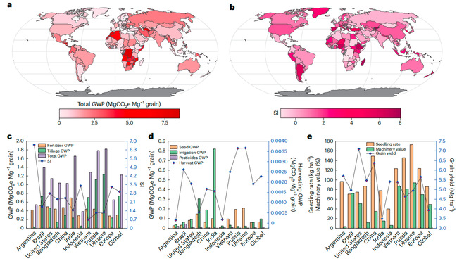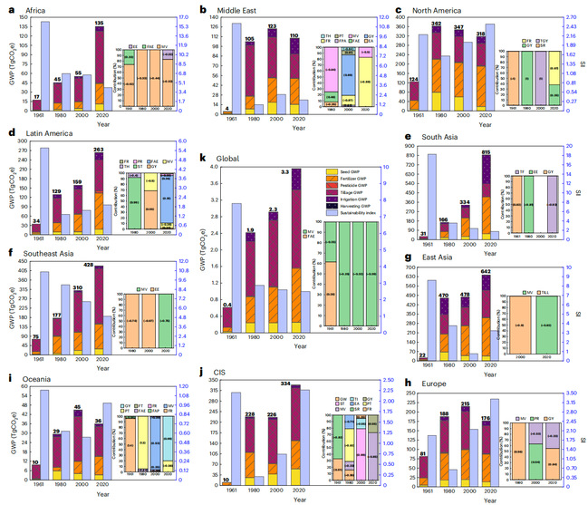 自“绿色革命”以来,农业的集约化生产带来了作物产量的大幅增长,但同时也增加了农业生产过程中人为导致的温室气体排放。为回答全球不同国家和地区主要粮食作物(水稻、小麦、玉米)的常规集约化生产(“石油农业”生产方式)导致的全球增温潜势及系统可持续水平的差异,该论文开展了全球尺度主要粮食作物“从摇篮(种子)到大门(农田生产收获)”(cradle-to-gate)的综合量化分析。研究结果表明,从1961年至2020年,常规农业生产方式下主要谷物作物的全球增温潜势(GWP)增加了8倍,而其系统可持续性指数(SI)下降了3倍,其主要原因(90%)是由于生产过程中肥料使用量和地下水使用量增加10倍,机械化和灌溉面积增加2倍以上。该研究进一步分析指出在全球增温潜势高、可持续性指数低的一些地区,如南亚地区,其施肥、灌溉和耕作等产生的GWP从1961年到2020年分别增加了83、19和6倍,值得重点关注。