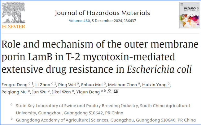 11月5日,华南农业大学生命科学学院邓诣群教授团队在Journal of Hazardous Materials期刊(中科院一区TOP期刊,影响因子12.2)上在线发表了题为“Role and mechanism of the outer membrane porin LamB in T-2 mycotoxin-mediated extensive drug resistance in Escherichia coli”的研究论文。该研究探讨了霉菌毒素对抗生素耐药性演化的影响,揭示了特异性孔蛋白在这一过程中的重要作用。
