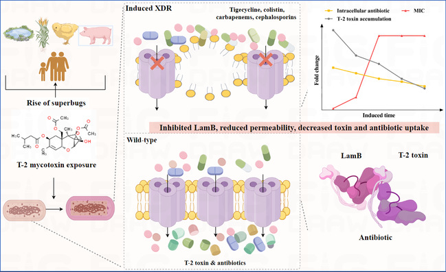 抗生素耐药性已成为全球公共健康和环境安全的重大威胁。细菌的细胞膜作为抵御外界恶劣环境的屏障,膜蛋白在细菌适应环境和发展耐药性方面发挥着关键作用。T-2毒素是由镰刀菌产生的最强毒性A类单端孢霉烯族霉菌毒素,且是主要的食品和环境污染物之一。该研究发现,低浓度的T-2毒素可诱导大肠杆菌(E. coli)表现出多重耐药性表型。在更低浓度(10-5 ng/mL)下的连续胁迫实验中,T-2毒素使E. coli ATCC 25922对13种关键抗生素产生了稳定的耐药性,其最低抑菌浓度增加了16倍至数千倍。转录组学分析表明,这种耐药性可能与细菌膜运输、应激反应以及mal基因簇中的相关基因有关。T-2毒素通过下调外膜孔蛋白LamB,降低了细胞膜的通透性,促进其自身的进入,同时减少了细胞内T-2毒素和抗生素的积累,从而加速了耐药性的形成。LamB在大肠杆菌的广泛耐药(XDR)中发挥了关键作用,特别是在阻碍last-resort抗生素进入细胞方面,这使得现有治疗策略变得更加复杂。LamB与T-2毒素及多种抗生素具有高亲和力,其与美罗培南、亚胺培南、头孢他啶和头孢吡肟的结合位点及结合能值分别为-2.93、-2.58、-2.53和-4.3。