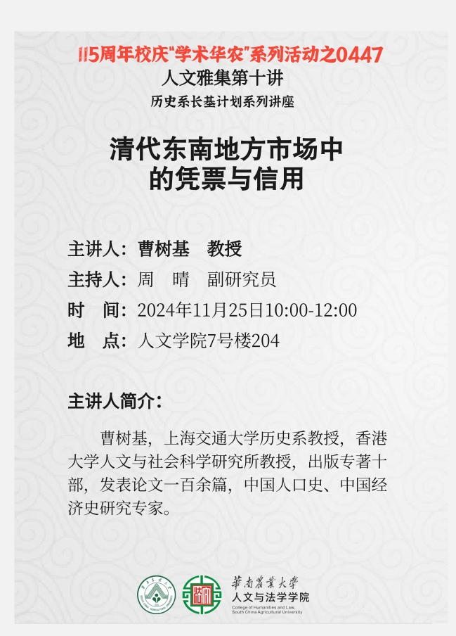 115周年校庆“学术华农”系列活动之0447:【人文雅集 】清代东南地方市场中的凭票与信用