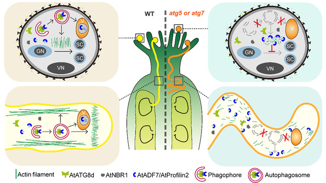 该研究通过对自噬核心功能突变体atg5、atg7及其双突变体的系统分析,重新阐明了自噬在拟南芥雄性生殖中重要的生物学功能。研究结果显示,这些突变体在花粉萌发、花粉管生长和种子结实率方面均表现出部分缺陷,相较于野生型有显著差异。更重要的是,该研究首次揭示,自噬通过选择性降解肌动蛋白解聚因子ADF7和Profilin2,调节花粉精细胞形成及花粉管生长时肌动蛋白动态组织。这一过程依赖关键自噬受体NBR1和ATI,精确靶向肌动蛋白解聚因子ADF7和Profilin2降解,从而维持细胞中微丝解聚和聚合的动态平衡,确保细胞骨架的空间组织和功能正常。
