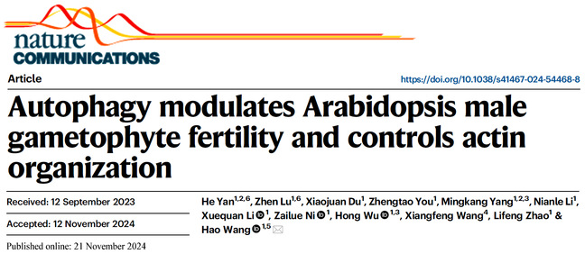 11月21日,华南农业大学生命科学学院王浩教授团队在Nature Communications(影响因子14.7) 上发表题为“Autophagy modulates Arabidopsis male gametophyte fertility and controls actin organization”的研究论文,该研究揭示了自噬在拟南芥雄配子体发育和育性中的重要生物学功能。