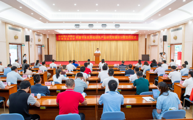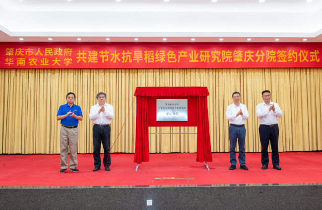 近日,华南农业大学节水抗旱稻绿色产业研究院与肇庆市农业农村局携手合作,共同签署了项目合作框架协议,揭牌成立华南农业大学节水抗旱稻绿色产业研究院肇庆分院。肇庆市市长许晓雄、副市长谢桂坤,华南农业大学校长薛红卫,农学院教授、节水抗旱稻绿色产业研究院院长、首席科学家罗利军教授出席签约仪式。