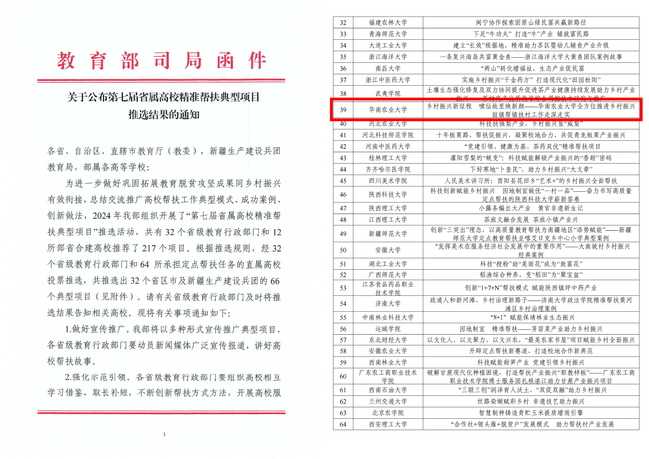 近日,教育部公布了第七届省属高校精准帮扶典型项目推选结果,经32个省级教育行政部门和64所承担定点帮扶任务的直属高校投票推选,我校申报的精准帮扶项目《乡村振兴新征程 啸仙故里焕新颜——华南农业大学全方位推进乡村振兴驻镇帮镇扶村工作走深走实》入选第七届省属高校精准帮扶典型项目。