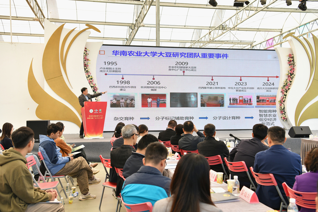 华农南方大豆创新研究院院长、生命科学学院院长王应祥教授介绍了我校南方大豆创新研究院整体情况。据悉,研究院于今年6月份成立,汇聚了包括2名院士、8名国家级人才在内的高水平科研团队,旨在通过推动和实施“北豆南移”,培育适应南方地区的高产优质高效多抗大豆新品种,研制机械化、智慧化等绿色低碳、轮作和间套作等栽培技术,在南方地区有效开发边际土地资源扩种大豆、提高土地复种指数和加快大豆生物育种进程。