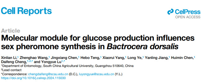 植物保护学院昆虫学系陆永跃/程代凤教授团队在国际知名期刊Cell Reports上发表题为”Molecular module for glucose production influences sex pheromone synthesis in Bactrocera dorsalis”的研究论文。该研究揭示了雄性橘小实蝇糖代谢的分子模块(PDF-BDTF-GLA)调控性信息素合成的机制。