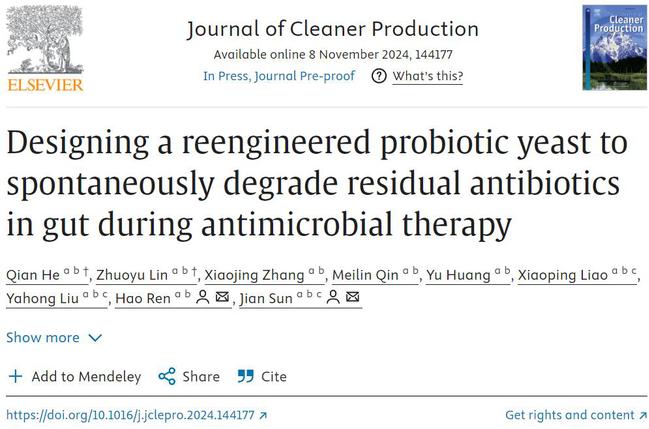 近日,兽医学院动物疫病预防控制全国重点实验室、国家兽医微生物耐药性风险评估实验室、广东省兽药研制与安全评价重点实验室孙坚教授团队在中科院一区Top期刊Journal of Cleaner Production (影响因子9.7)在线发表了题为“Designing a reengineered probiotic yeast to spontaneously degrade residual antibiotics in gut during antimicrobial therapy”的研究长文。