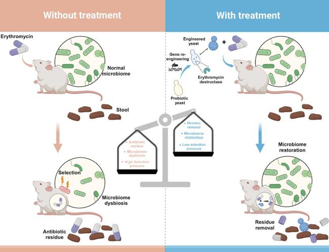 上述工作利用功能益生菌定向清除动物肠道抗生素残留,能够在不影响血药浓度与药物疗效的情况下,降低服用抗生素动物粪便中的药物残留,大幅度缓解抗生素治疗过程中对动物肠道菌群的选择压力,减少细菌耐药性的进化传播,避免动物因使用抗生素而导致“二重感染”的出现,是耐药性防控与药物合理施用的新方案。