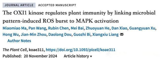 近期,生命科学学院梁祥修实验室在Plant Cell期刊发表了题为“The OXI1 kinase regulates plant immunity by linking microbial pattern-induced ROS burst to MAPK activation”的研究论文。该研究发现一个已知受到ROS信号激活的蛋白激酶OXI1与LYK5、CERK1互作,是植物免疫受体复合体新组分。在oxi1突变体中,chitin诱导的MAPK激活和ROS爆发比野生型降低。进一步研究发现,OXI1与识别不同微生物分子模式的多种免疫受体都存在蛋白互作,且不同微生物分子模式诱导的MAPK激活在oxi1突变体种都显著降低。与之一致的是,oxi1突变体对真菌、细菌、卵菌病害的抗病性也都显著降低。