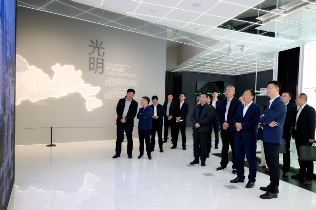深圳市光明区是深圳最年轻的行政区,是大湾区综合性国家科学中心先行启动区,当前正加快建设世界一流科学城,打造更具全球影响力的产业科技创新中心和粤港澳大湾区高水平人才高地核心承载区。中心组一行参观光明区城市规划展览馆和深圳湾实验室,了解光明区创新链、产业链、资金链、人才链“四链”融合发展的进取和成效。双方就发挥学校和光明区各自优势,协同推进深圳研究院建设,促进科技创新成果转化等合作事项进行深入交流。