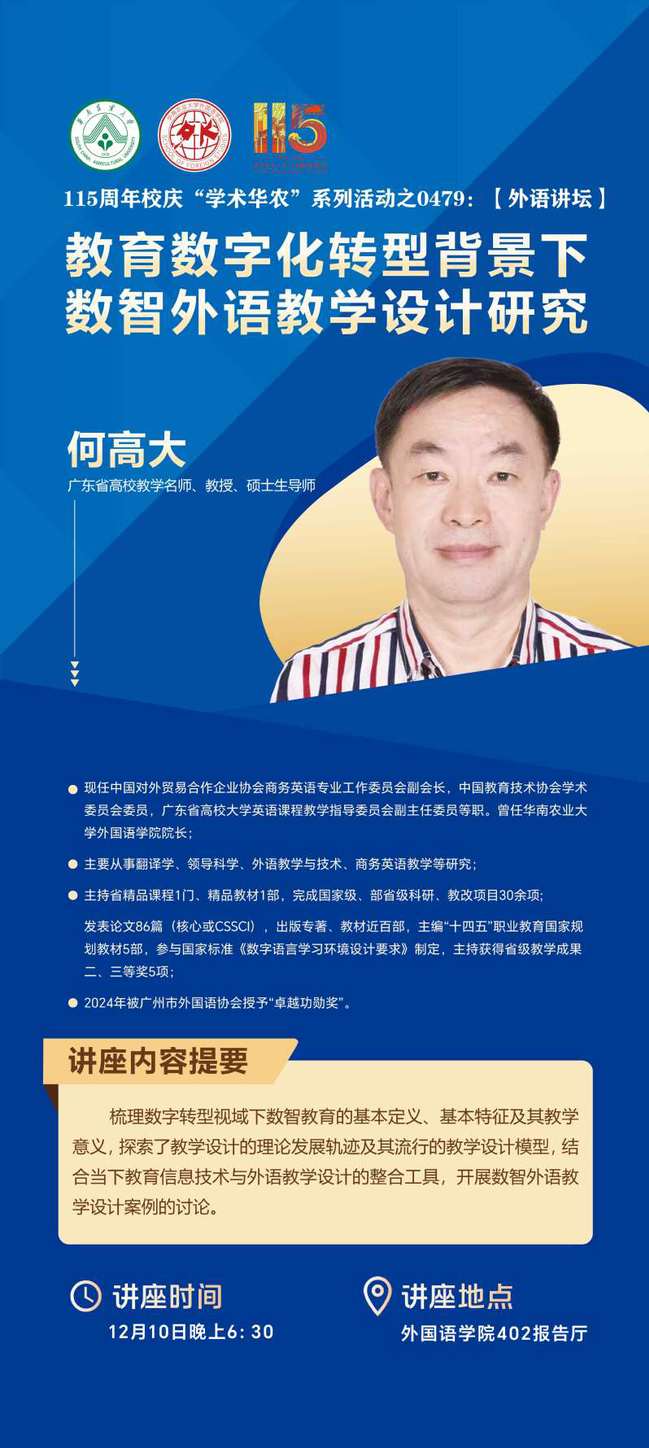 115周年校庆“学术华农”系列活动之0479:【外语讲坛】 教育数字化转型背景下数智外语教学设计研究