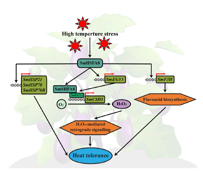 该研究结果表明,高温胁迫下,SmHSFA8基因上调表达;随后,SmHSFA8激活SmHSPs基因的表达,介导SmEGY3-SmCSD1模块和促进SmF3H介导的类黄酮生物合成,进而调控茄子的耐热性。本研究为开展茄子抗逆分子育种和选育茄子耐热材料提供有用的基因资源和理论依据。