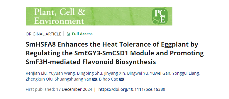 12月17日,我校园艺学院曹必好教授团队在Plant, Cell & Environment(中科院一区,影响因子7.6)在线发表了题为SmHSFA8 Enhances the Heat Tolerance of Eggplant by Regulating the SmEGY3-SmCSD1 Module and Promoting SmF3H-mediated Flavonoid Biosynthesis的研究论文。文章探究了SmHSFA8通过调控SmEGY3-SmCSD1模块和SmF3H介导的类黄酮生物合成提高茄子耐热性的分子机制。