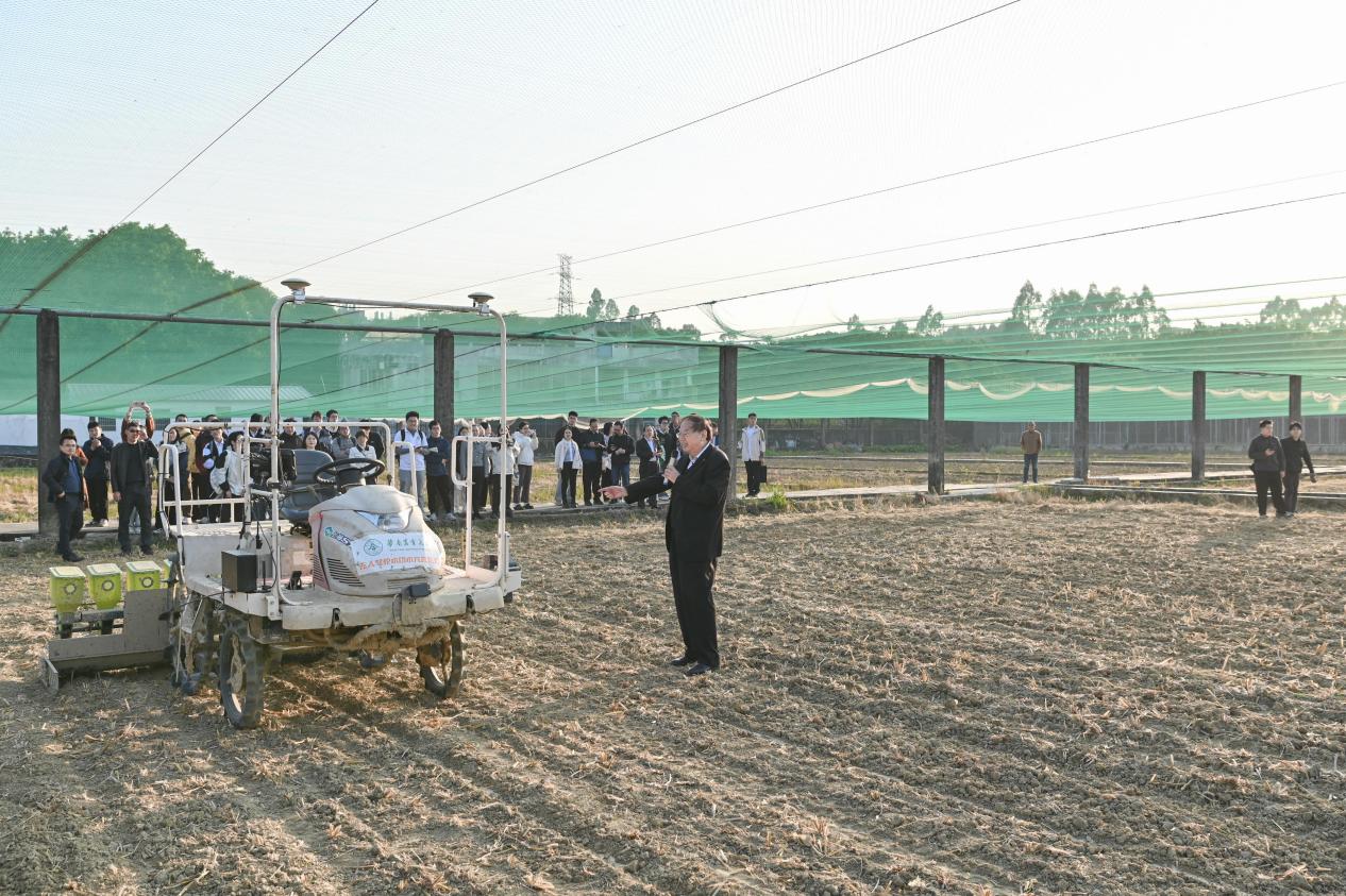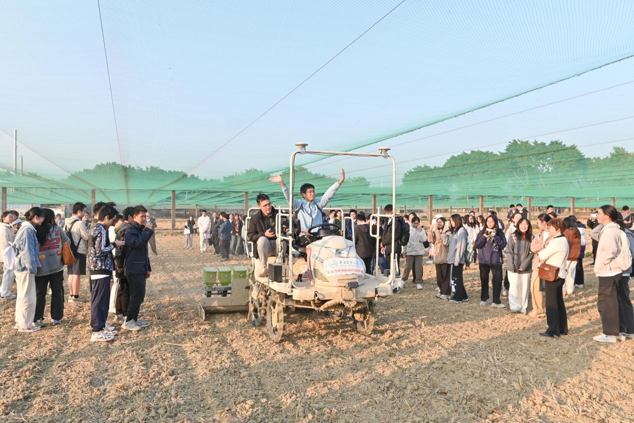 在学校五山教学科研启林基地,罗院士现场演示了无人驾驶拖拉机、直播机等智能农机装备。这些农机是罗院士带领团队在国内率先研发成功的农业高科技,同学们争相坐上智能农机“零距离”体验智能耕种,真切感受智慧农业魅力。