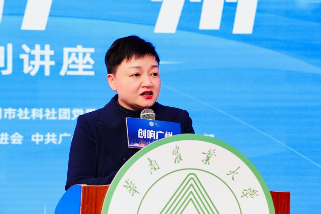 广州市社科联党组成员、专职副主席胡子英在致辞中肯定了我校在人才培养方面作出的重要贡献,并对华农学子寄予厚望,鼓励他们积极参与“创响广州”系列活动,从中汲取业界大咖带来的奋斗经验,获得向上的力量,锚定青春的航向,共筑创新的梦想。