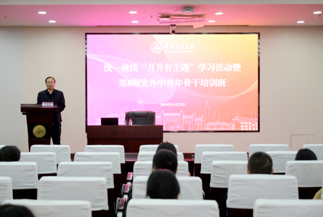 1223-26日,学校顺利举办第8期党外中青年骨干培训班,校党委副书记丁红星出席开班仪式并作动员讲话。本次培训旨在深入贯彻习近平总书记关于做好新时代党的统一战线工作的重要思想和习近平文化思想,广泛凝聚思想共识,更好发挥我校统一战线强大法宝作用,为学校“双一流”建设贡献统战力量。
