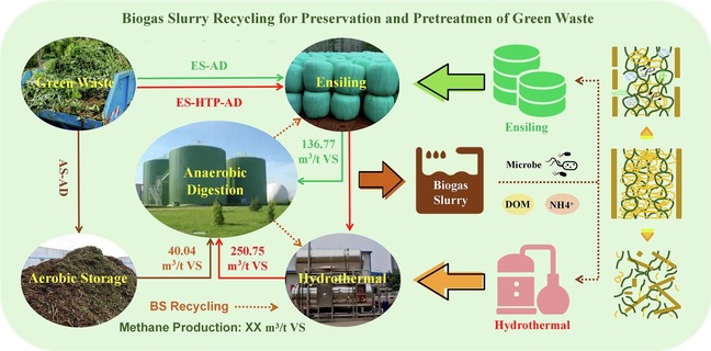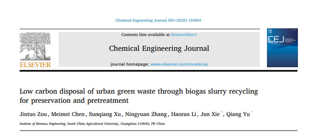 园林绿化废弃物(简称绿废)是第二大城市有机固废。将绿废用于厌氧消化生产沼气是一种低碳的处置方法。然而,当前使用绿废作为主要原料的沼气工程面临着原材料供应波动、发酵效率低以及沼液处理困难等挑战。团队提出了沼液循环回用强化绿化废弃物厌氧消化的技术路线,探讨了在绿废保存和预处理阶段回用沼液对原料组分和后续厌氧性能的影响。通过添加沼液进行青贮实现了可持续的绿废原料供应,避免了季节性产量波动的影响。经过3个月和6个月后的青贮后,与对照组相比,添加灭菌沼液青贮的处理组产甲烷潜力分别增加了10.17%和14.65%。在预处理过程中回用沼液可以提高绿废水解和产甲烷速率。使用沼液代替水作为水热预处理反应介质,绿废和青贮绿废的产甲烷潜力分别提高了62.40%和47.46%。通过将沼液循环回用,控制和管理沼液的营养物质释放,解决了沼液消纳困难、污染环境的问题。同时基于该技术,对广州市园林绿化废弃物处置的调配策略和碳减排效益进行了简短分析。该研究对解决绿化废弃物处置难题、改善能源结构、促进循环经济发展具有一定的启发意义。此研究成果发表在Chemical Engineering Journal (工程技术1区,Top,影响因子13.4)上,题目为“Low carbon disposal of urban green waste through biogas slurry recycling for preservation and pretreatment”,文章第一作者为博士生邹金拓,通讯作者为余强研究员和谢君教授。