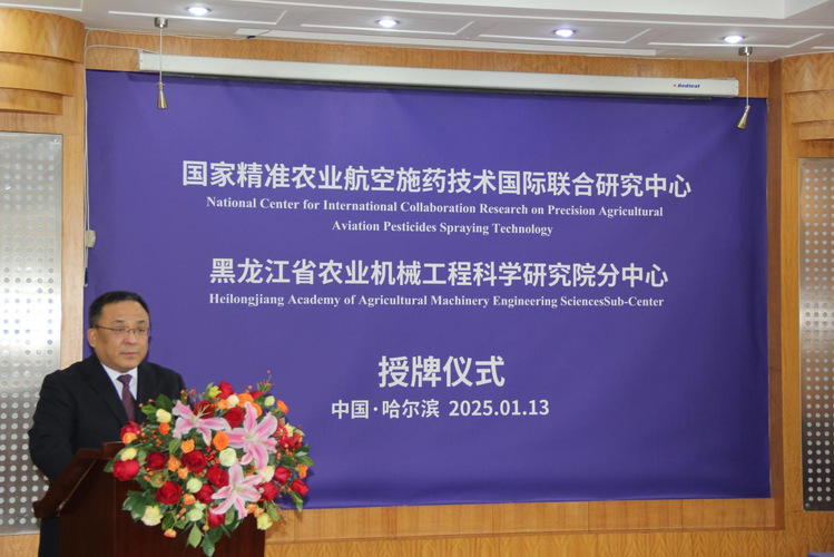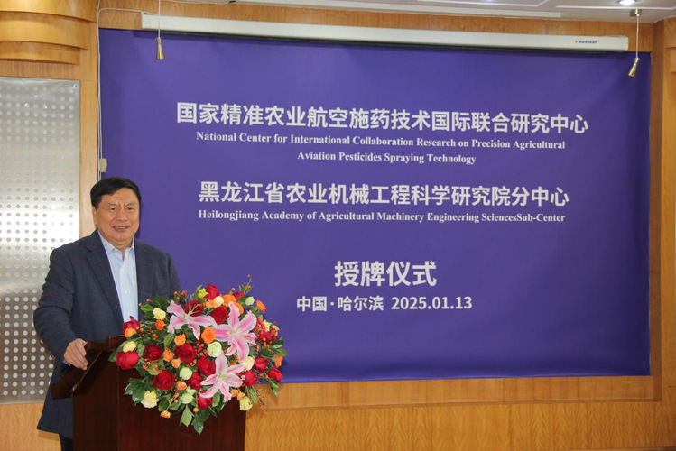 兰玉彬在致辞中对分中心的成立表示祝贺。他回顾了国家精准农业航空施药技术国际联合研究中心的发展历程,指出其作为科技部批准的国家级平台,已在美国、澳大利亚、加拿大、英国、法国、西班牙、韩国、巴基斯坦等8个国家设立海外分中心,国内在农业农村部南京农业机械化研究所、山东理工大学、沈阳农业大学、安阳工学院设立了4个分中心。黑龙江省农机院作为国内设立的第5个分中心,在航空植保、无人机遥感技术等相关精准农业领域,发展和应用场景广阔。他希望省农机院分中心充分发挥科研优势、人才优势、地理优势,赋能农机高质量发展。