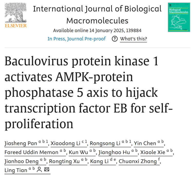 近日,动物科学学院田铃教授团队在International Journal of Biological Macromolecules (影响因子7.7,中科院一区)上在线发表了题为“Baculovirus protein kinase 1 activates AMPK-protein phosphatase 5 axis to hijack transcription factor EB for self-proliferation”的研究论文,揭示了家蚕核型多角体病毒(Bombyx mori nucleopolyhedrovirus, BmNPV)通过调节宿主家蚕的转录因子EB (B. mori transcription factor EB, BmTFEB) 来促进自身增殖的分子机制,为杆状病毒病毒–宿主互作提供了新的见解。