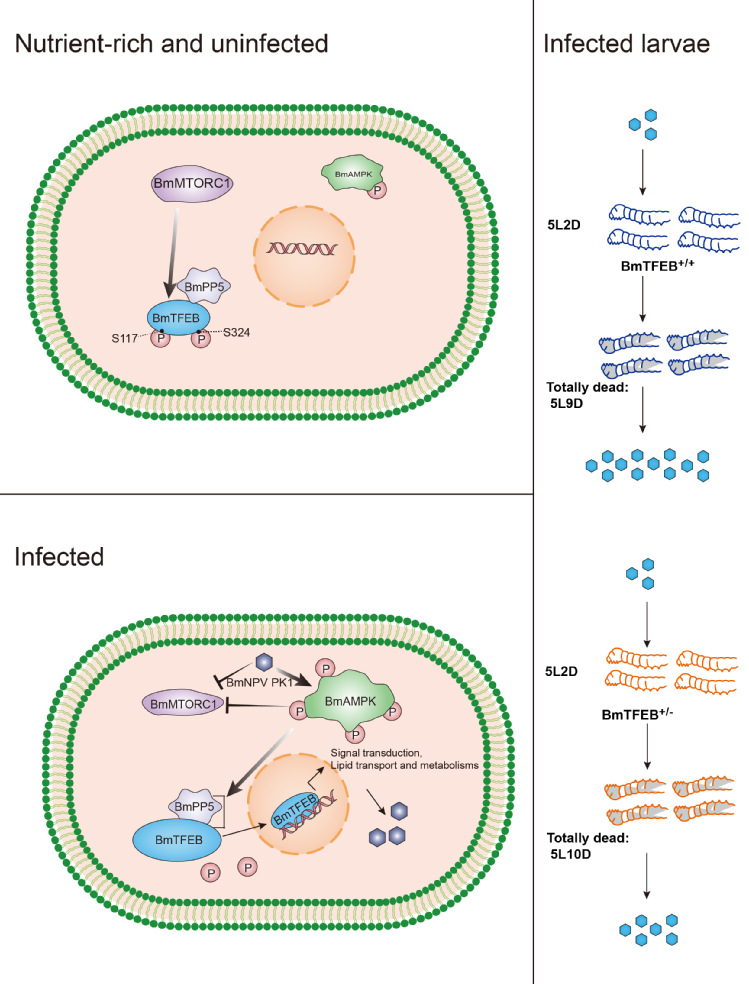 因此,团队深入的研究了BmNPV与家蚕BmTFEB之间的详细互作机制。研究明确揭示了两条关键的信号传导通路:1. BmNPV中的蛋白激酶1(protein kinase 1, PK1)蛋白通过激活家蚕AMP激活蛋白激酶(B. mori AMP-activated protein kinase, BmAMPK)信号,介导家蚕丝氨酸/苏氨酸蛋白磷酸酶5 (B. mor Serine/Threonine protein phosphatase 5, BmPP5)与BmTFEB的结合,导致转录因子BmTFEB在S117和S324位点去磷酸化,并随后转移到细胞核中,激活了有利于病毒增殖的下游基因的表达;2. BmNPV中的PK1蛋白通过抑制家蚕雷帕霉素靶蛋白复合体1 (B. mori target of rapamycin complex 1, BmMTORC1)信号,导致转录因子BmTFEB去磷酸化入核,促进病毒增殖。