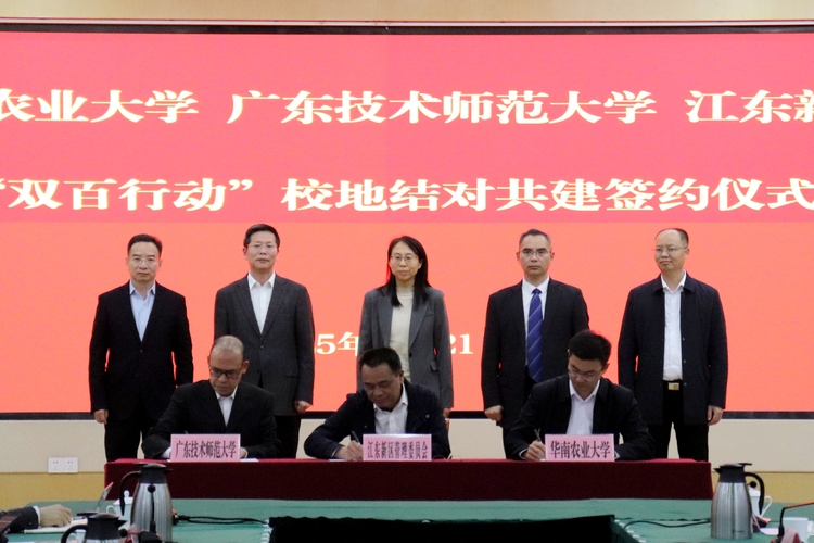 为进一步推动学校服务河源市“双百行动”和驻镇帮镇扶村工作落地见效,1月21日下午,我校副校长陈乐天率队赴河源市调研推进“双百行动”和驻镇帮镇扶村工作,并参加华南农业大学、广东技术师范大学、江东新区“双百行动”柔性结对校地共建签约仪式。河源市副市长谢春艳、广东技术师范大学副校长苏晖、河源市教育局局长杨利华、江东新区管委会主任杨志,以及三方相关部门主要负责同志出席仪式。
