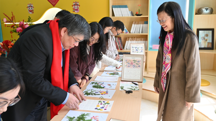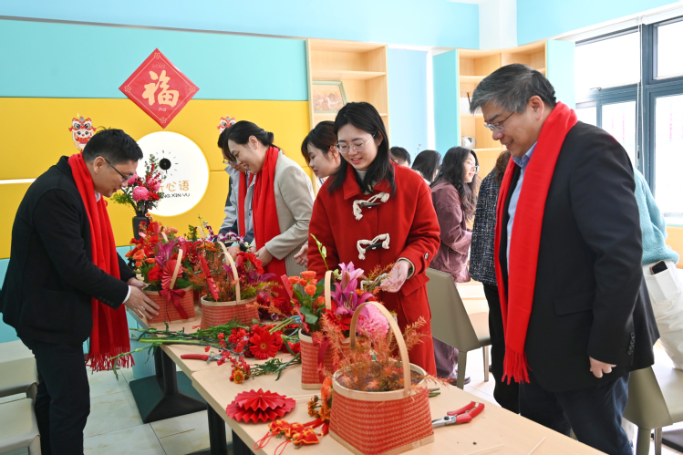 橙红喜庆的年花散发着清香,别具一格的压花精致优雅……薛红卫还与同学们一同前往活动室,动手体验插花和压花的乐趣。在园艺学院陈国菊教授的指导下,一件件造型别致、寓意美好的作品顺利完成。“今年举办的活动很有仪式感,红火的配色年味十足,让我倍感温暖的同时也亲身感受到了年俗传统的魅力。”来自园艺学院的邓文琪同学表示。