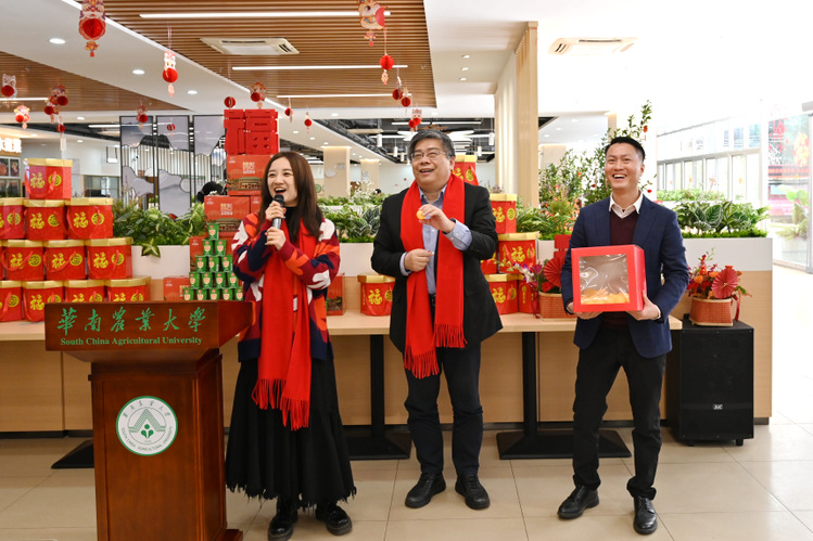 “鸿运当头”“前程似锦”“星光金沙满华堂”……莘园饭堂一楼,一道道色香味俱全的吉祥菜在餐桌上摆好,配上华农酸奶,令人食指大动。薛红卫与留校同学共举酸奶开宴,为大家送上新春祝福,并派发了新春红包、礼包。