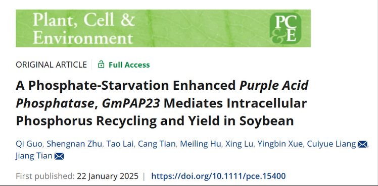 近日,资源环境学院根系生物学研究中心田江研究员课题组在Plant, Cell & Environment(中科院一区Top期刊)发表了题为“A Phosphate‐Starvation Enhanced Purple Acid Phosphatase, GmPAP23 Mediates Intracellular Phosphorus Recycling and Yield in Soybean”的研究论文。