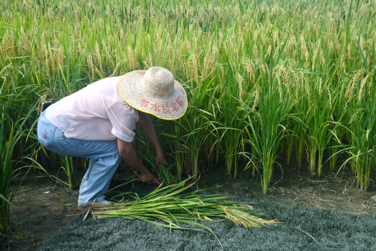 节水抗旱稻佛山“首秀”,工作人员示范收割